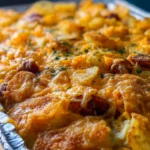 - In a large mixing bowl, combine the diced hash browns, French onion dip, cream of chicken, half of the melted butter, 1 cup of shredded cheddar cheese, salt, pepper, smoked paprika, onion powder, and garlic powder. Mix well.