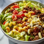 - Assemble salad: In a large bowl, combine the lettuce, cooked beef, cheese, pickles, onions, and tomatoes.