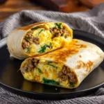 - Assemble the burrito by adding the sautéed spinach, sausage, and scrambled eggs to the warm tortilla.