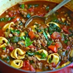 A warm and comforting Tortellini Soup filled with Italian sausage, fresh cheese tortellini, and vibrant greens, perfect for family gatherings on chilly evenings.